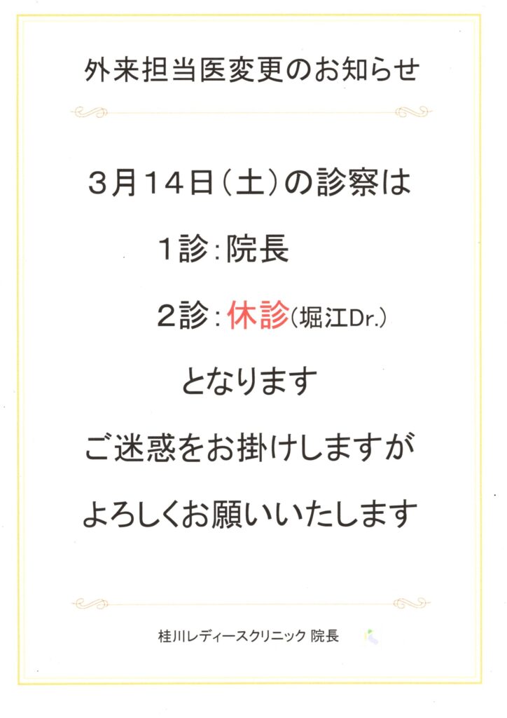 3月14日(土)堀江先生の外来(2診)は休診となります。