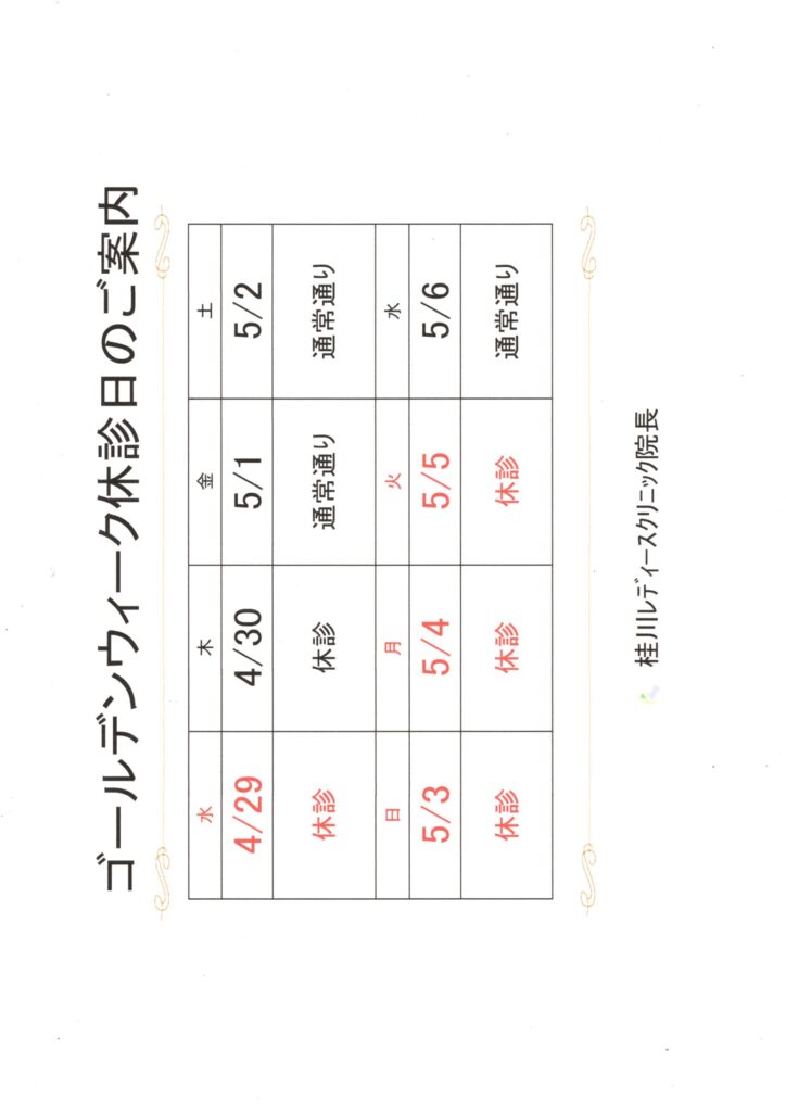 トップページ お知らせ ゴールデンウイーク休診日のご案内 2026.04.22 ゴールデンウイーク休診日のご案内 お知らせ ゴールデンウイーク休診日のご案内です。下記カレンダーにてご確認よろしくお願いいたします。