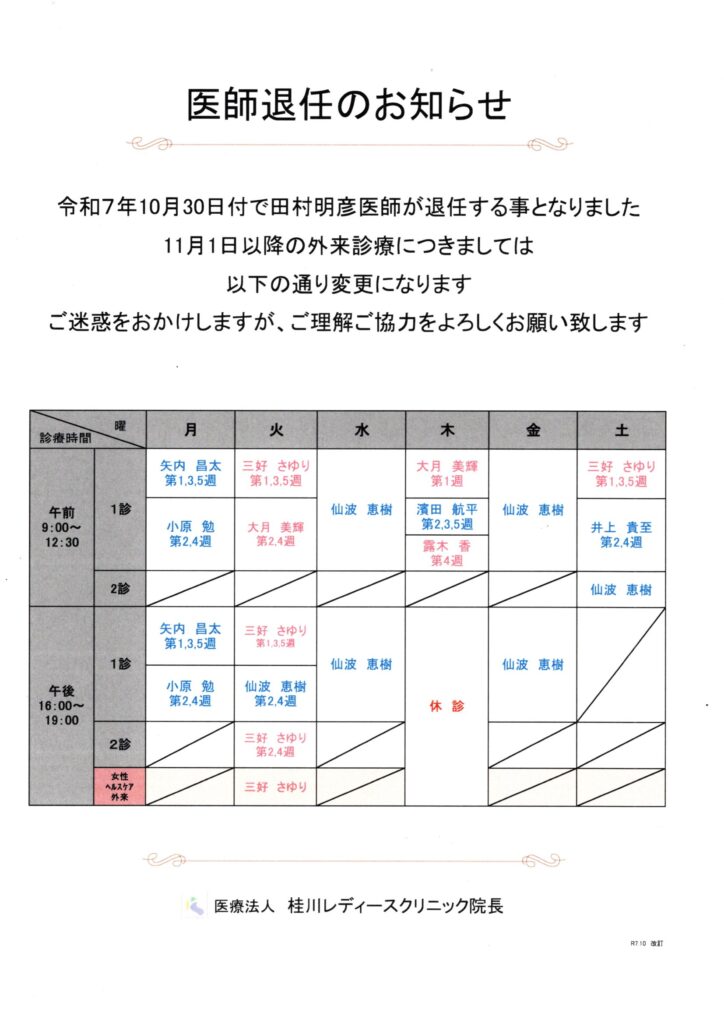 トップページ お知らせ 医師退任のお知らせ 2025.10.04 医師退任のお知らせ お知らせ 令和7年10月30日付で田村明彦医師が退任することとなりました11月1日以降の外来診療は以下の通り変更になりますご理解ご協力をよろしくお願いいたします