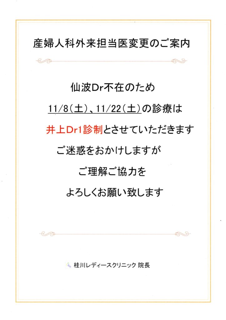 トップページ お知らせ 産婦人科外来担当医変更のご案内(11/8.11/22) 2025.10.27 産婦人科外来担当医変更のご案内(11/8.11/22) お知らせ 11月8日(土)22日(土)は、仙波Dr不在のため井上Drの1診制とさせていただきます。よろしくお願いいたします。